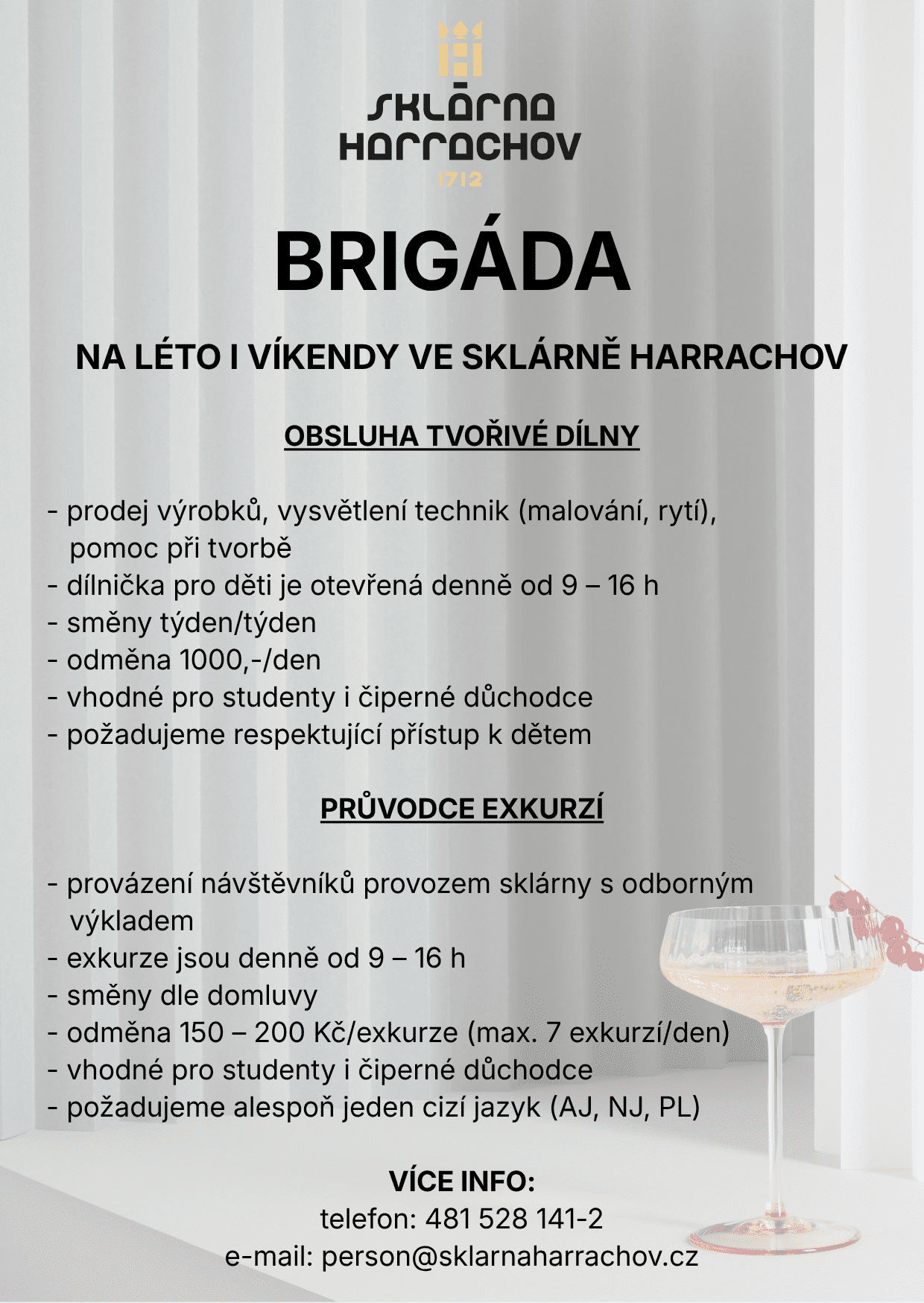 VÍCE INFO: telefon: 481 528 141-2 e-mail: person@sklarnaharrachov.cz