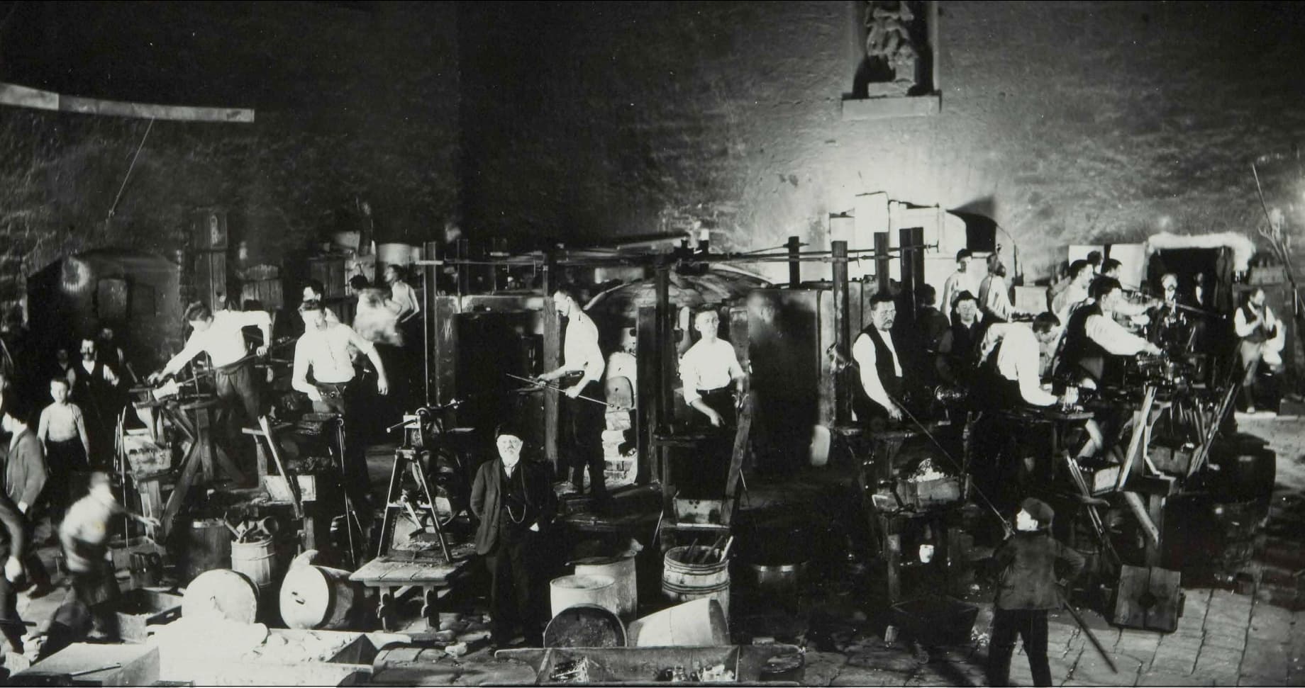 By the late 19th century, the glassworks had about 400 employees, and in 1895, a large grinding shop with electric lighting and water turbine power, now a national technical monument, was established.